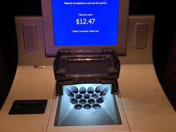 换硬币的机器长这个样子,把一大堆没用的硬币倒进去。机器内部开始旋转,利用惯性差将硬币分类,计算总额。然后在左侧黑色的槽里吐出收据。