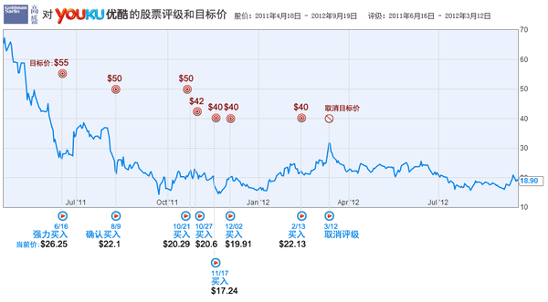 一年半以来优酷的股价持续下跌,高盛却不断抛出极高的目标价,并建议投资者买入。