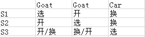 (其中开羊1门和羊2的概率是1/3下的两种对称情况,各自概率为1/3再除以2,是1/6,合计仍然为1/3)